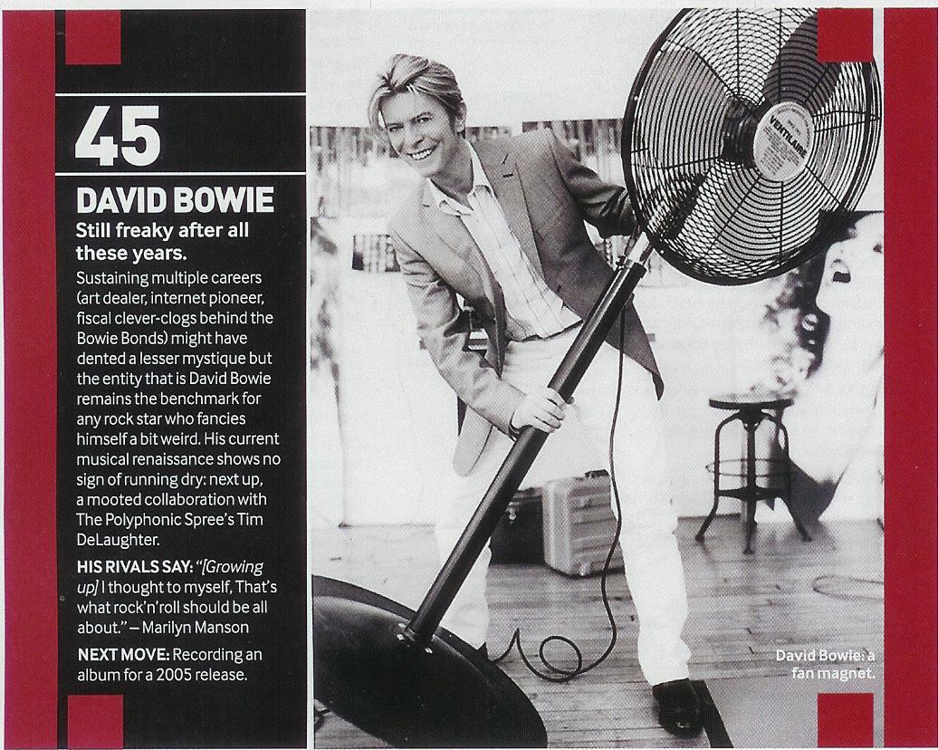 26. Alain Levy 27. Madonna* 28. Beyonce Knowles 29. Michael Bebel* 30. Thom Yorke 31. Rich Harrison 32. Yoko Ono 33. Terry McBride 34. R Kelly 35. Spike Jonze 36. Antonio Reid 37. Linda Perry* 38. The Neptunes 39. Jay Berman 40. Dido* 41. Rod Smallwood & Andy Taylor 42. Usher 43. Kevin Weatherly 44. Jeff Kwatinetz 45. David Bowie* 46. Justin Timberlake 47. Red Hot Chili Peppers 48. Jay Z 49. Prince* 50. Norah Jones |