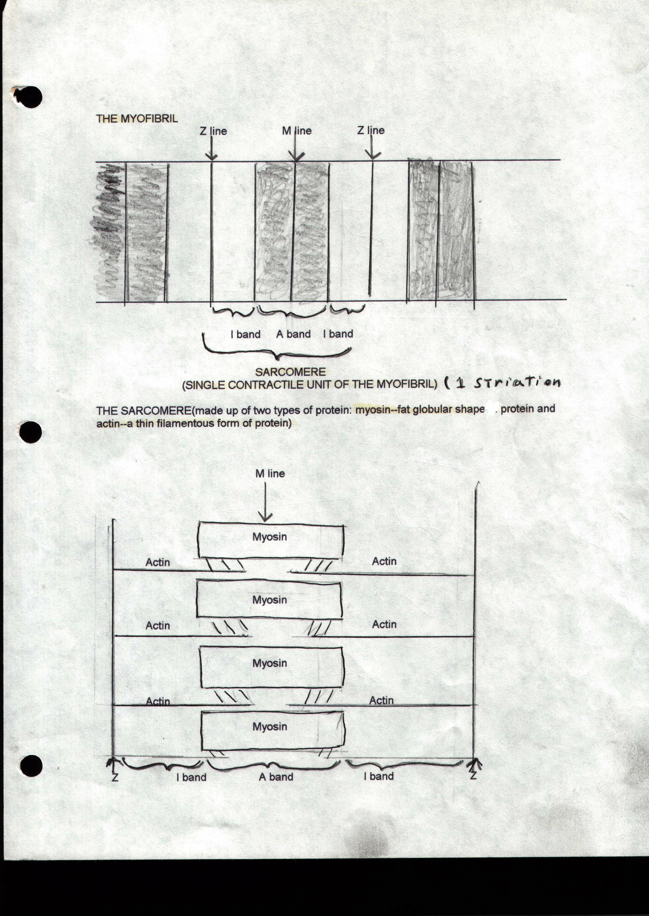 SKELETAL MUSCLE I) Structure of a Skeletal Muscle: Each muscle is surrounded by a dense irregular sheath of connective tissue called the epimysium. Each bundle of muscle fibers called a fascicle is covered by a layer of fibrous connective tissue called the perimysium. Each muscle fiber within the fascicle is covered by a layer of connective tissue consisting of mostly reticular fibers called the endomysium. All three connective tissue layers converge and join with each other to form the tendon so that when the muscle fibers contract they pull on the connective tissue sheaths which forms into the tendon transmitting the force along the tendon to move the bone. II) Skeletal muscle interaction: 1) Skeletal muscles are attached to bones by tendons. The two points at which they are attached are called the point of insertion (attachment on the bone that it moves) and the point of insertion (attachment point of attachment). As a muscle shortens or contracts it moves toward the point of insertion resulting in a "pulling" force on the bone that it moves. 2) Muscles are classified into four functional groups: a) Prime movers or agonists are muscles that produce a particular force that produces a specific movement such as the biceps brachii which inserts on the radius and flexes the elbow. b) Antagonists are muscles that oppose or reverse a particular movement and are located on the opposite side of the agonist. The antagonist of the biceps brachii would be the triceps brachii. The triceps will relax when the elbow is flexed by the biceps or it may be partially contracted to slow down or even stop flexion of the elbow. The triceps brachii when contracted will extend the elbow and then can be classified as the prime mover and then the biceps becomes the antagonist c) Synergists are muscles which help prime movers perform their movement by adding extra force or they can be used to reduce unnecessary movement as the prime mover contracts such as the synergists which stabilize our wrist as we make a fist. The tendons of the flexor muscles of our fingers cross both the wrist and the phalangeal joints. Synergistic muscles in the wrist stabilize the wrist as we make a fist or our wrist would bend as we make a fist. d) Fixatiors are muscles that immobilize a bone or a muscle's origin. Examples would include the muscles that contract and cause us to maintan an upright posture. III) Microscopic Anatomy of a Muscle Fiber: a)Each muscle fiber is a long cylindrical cell with multiple nuclei (syncytial) within its plasma membrane called the sarcolemma. Within the sarcolemma of the muscle fiber is the sarcoplasm or cytoplasm of a muscle cell or fiber. The sarcoplasm differs from the cytoplasm of other cells in that it contains large amounts of glycosomes (stored glycogen) along with an oxygen binding protein called myoglobin. The usual organelles are present and packed between sometimes a thousand rodlike structures called myofibrils which run the length of the muscle fiber. The myofibrils are the contractile elements of the skeletal muscle cells. b) Striated muscles are said to have striations or stripes. These striations are due to the presence of two types of protein found within the myofibrils. A globular protein known as myosin and a long filamentous protein called actin. Each myofibril is divided into individual contractile units called sarcomeres which contain layers of myosin and actin in such a way as to form the striped appearance of skeletal muscle that we see under the microscope. Each stripe or striation, if observed closely can be divided into different bands. A sarcomere is the region of a myofibril between what is known as the Z discs or Z lines. These are where a single sarcomere begins and ends. In the middle of each sarcomere is the stripe or striation that we see under the microscope. There is actually a series of repeating dark A bands (stripes in the middle of the sarcomere) and light I bands. The I bands have a midpoint dark line interruption called the Z disc that we just mentioned. The A bands also have a midpoint dark line interruption called the M line. The M line appears only in a contracting muscle and a lighter band appears in a resting muscle called the H zone. c) The Z lines are composed of proteins called connectens which act to connect each sarcomere with each other so that they can contract as if one unit within the myofibril. The I bands consists of thin filamentous protein molecules called actin which are inserted between larger myosin molecules within the A band. The I band therefore consists of actin molecules only and the A band consists of alternating layers of myosin and actin molecules and is why the A band appears much darker. When a muscle contracts the actin molecules slide between the myosin molecules in successive sarcomeres. The M line is composed of fine protein or desmin strands that hold adjacent myosin molecules together. d) Myosin molecules have a rodlike tail consisting of two interwoven heavy polypeptide chains. At the ends of the heavy chains are two swollen areas called heads. They are swollen because of the attachment of a lighter polypeptide chain. The "head" are also called the cross bridges because they link the thick filaments of myosin with the thinner actin filaments during contraction. Each thick filament contains about 200 myosin molecules and are bundled together in such a way that their tails form the central part of the filament and their heads facing outward and in opposite direction. The heads of the myosin molecules contain ATP binding sites and ATPase enzymes that generate energy for muscle contraction. e) Actin molecules are polymers which are large molecules made up of many smaller molecules bonded together called monomers. The monomer for an actin molecle is called globular actin or G actin. The G actin molecules bear the active sites to which the myosin molecules attach. Each actin filament bends back on itself and winds around itself f