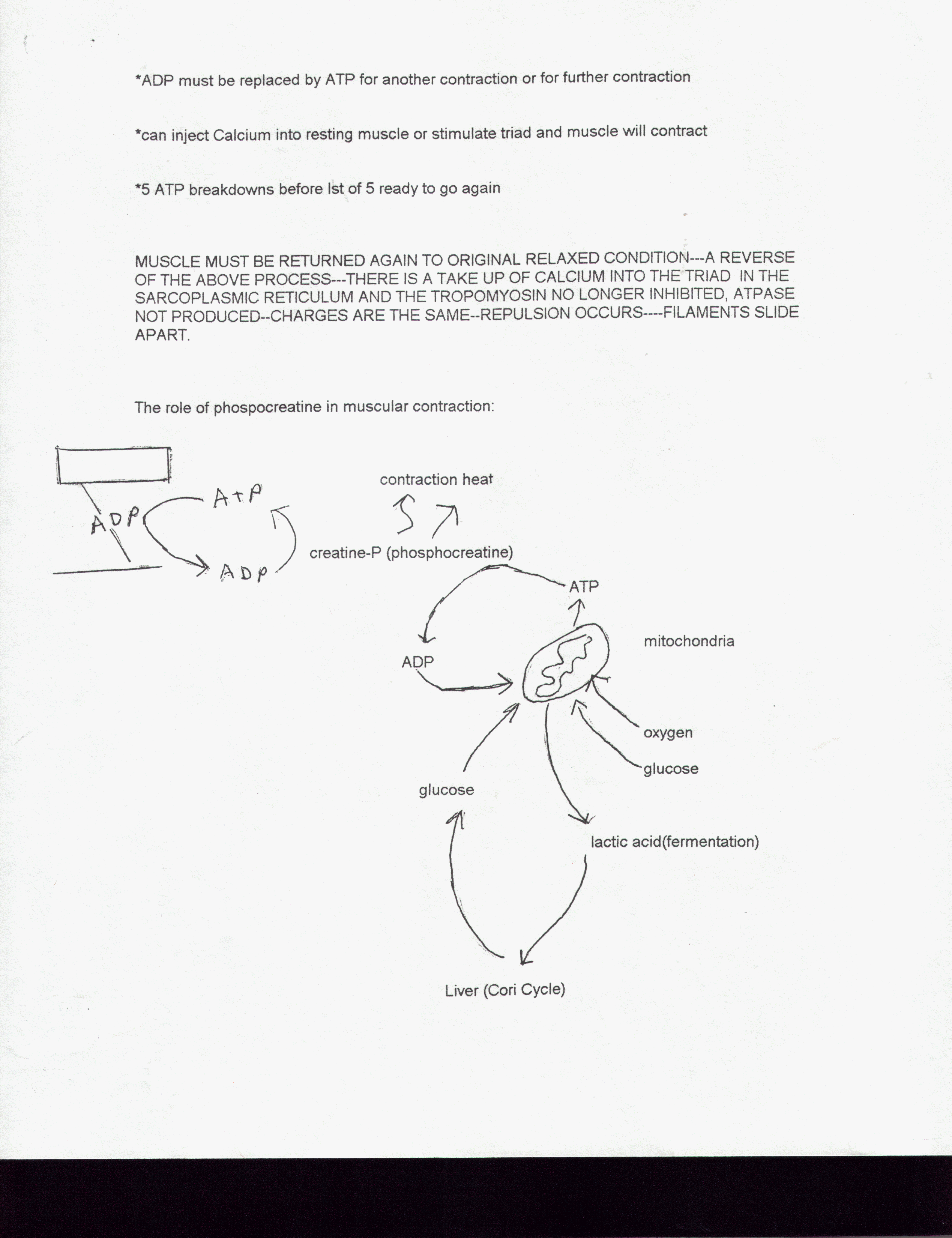 2) The Neuromuscular Junction and the Nerve Stimulus a) An impulse or a message sent from the brain through a nerve cell called a neuron. The point at which the end of the neuron (the axon) reaches the muscle is called the neruomuscular junction. The axonal endings and the muscle fiber are very close and remain separated by a space called the synaptic cleft. The synaptic cleft is filled with a gel-like extracellular substance rich in glycoproteins. Within the axonal ending are synaptic vesicles containing a neurotransmitter called acetylcholine (ACh). The muscle fiber's contribution to the neuromuscular junction is the motor end plate and is highly folded providing a large surface area for the millions of ACh receptors found there. b) When the nerve impulse reaches the end of an axon calcium channels in its membrane open, allowing calcium to flow in from the extracellular fluid. The presence of Calcium inside of the axon terminal causes some of the synaptic vesicles to fuse with the axonal membrane and release ACh into the synaptic cleft by exocytosis. ACh diffuses across the cleft and attaches to the ACh receptors on the sarcolemma. At this point electrical events are triggered here that take place in excited nerve cell membranes (figure 9.9) 3) The Muscle Twitch and the Development of Muscle Tension a) The response of a muscle to a single brief threshold stimulus is called a muscle twitch, during which the muscle contracts quickly and then relaxes. The muscle is attached to an apparatus called a myogram which records the contractile activity graphically. Three phases are apparent in a myogram: 1) Latent Period: the first few milliseconds after muscle stimulation during which excitation contraction coupling is occurring (figure 9.10). Muscle tension here is beginning, but no response is seen on the myogram during this period. 2) Period of Contraction is when the cross bridges are active from the beginning to the end of tension development. The myogram peaks and this period lasts for 10-100ms. 3) Period of Relaxation is the final phase lasting 10-100 ms and is initiated by reentry of Calcium into the SR. Contractile force decreases to zero and the tracing returns to baseline. The muscle now returns to its normal length. **twitch contractions can be rapid and brief as with eye movements or can occur more slowly during which the muscles can remain contracted for longer periods such as in larger muscles like the gastrocnemius and the soleus (figure 9.12).