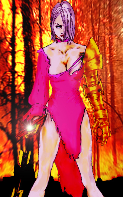 fire as a background to give a hint of her history. The fire represents the torn home from where she was raised at and the