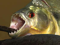 Piranhas are flesh - eaters and can eat you alive. Their teeth are as sharp as knifes and they can tear you apart very fast and easily. They sometimes fight over prey and they do what they do to their prey. If you see a tank full of piranha Id stay away from it and don't tease them or they will jump out of the tank and literally bite you and wont let go. I would stay away from them.