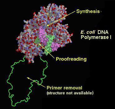 DNA polymerase III holoenzyme synthesizes most new DNA as part of a multisubunit assembly, while polymerase I erases the primer and fills in the gaps. The holoenzyme catalyzes the rapid formation of mny thousanda of phosphodiester bonds before releasing the tempate. It is designed to grasp the template by means of a hollow beta2 subunit which encircles the template and acts as a sliding clamp.