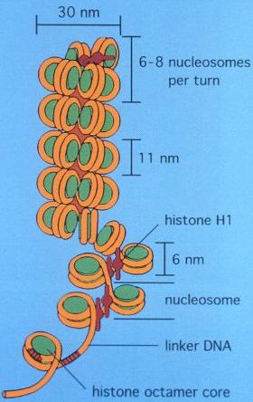 The entire DNA-protein complex of eukaryotes, made up of repeating nucleosomes is the chromatin. Heterochromatin is very highly condensed, transcriptionally inactive and makes up about 10% of the chromatin in the non-dividing cell. The rest is euchromatin: decondensed and distributed throughout the nucleus. About 10% of the euchromatin is transcriptionally active, in a more decondensed state that allows transcription.