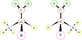 All standard amino acids (except glycine) have a chiral a carbon, i.e. the first carbon in the chain has four different groups around it. Chiral amino acids can exist as stereoisomers (same molecular formula, different spatial configuration). Amino acids which are mirror images of each other (enantiomers) are designated D (amino group on the right side) and L (amino group on the left side). All chiral standard amino acids occur naturally only in the L configuration.