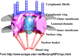 (NPC) is composed of multiple copies of about 50-100 proteins called nucleoporins.
