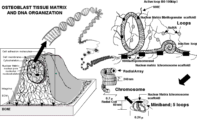 The tissue matrix is a dynamic linkage between structural proteins of the extracellular matrix, the cytoplasm and the nucleus. The nuclear matrix is a proteinaceous substructure of the nucleus that resists nuclease digestion and high salt extraction.