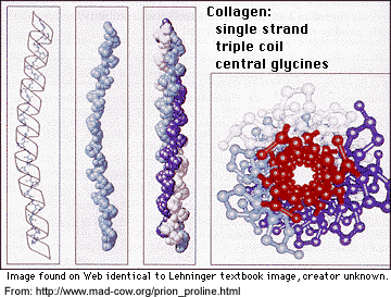 Collagen is an important fibrous protein. Glycine is important in the structure of collagen because it is found every third residue, at the meeting points of the three chains. Any other amino acid would not fit in that position, and would lead to bone deformities.