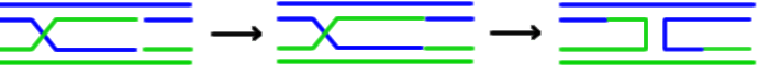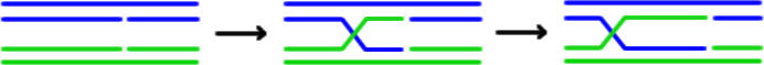 Then branch migration occurs: simultaneous winding and unwinding so there is no net change in the amount of base pairing but the position of the cross-over point moves, resulting in more heterogeneous duplex. After DNA ligase seals the nick, further branch migration occurs, still four strands are held together at the crossover point.