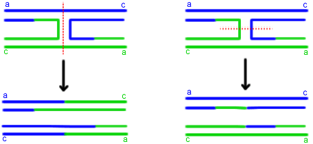 Rotation of the molecule forms a Holliday intermediate. The molecules are separated by a pair of symmetrical cuts, and the ends are resealed by DNA ligase. The direction of the cut determines whether flanking regions are exchanged. If the crossed strands are cut, the flanking markers would remain as they were and recombination could not be detected. If the intact strands are cut, the flanking markers are exchanged and the recombination event could be detected.