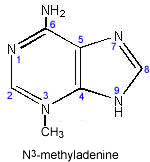 Alkylation damage is the addition of a methyl group to a base. O6-methylguanosine will pair up with thymine instead of cytosine, leading to a lot of mispairing and a very high rate of mutation. N3-methyladenosine is also common. Oxidative damage is due to cell metabolism and stimulated by oxidizing agents, and is an important cause of alkylation damage.