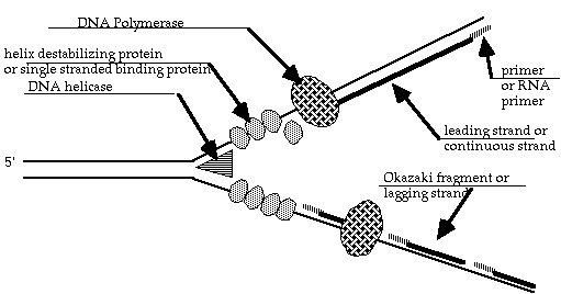 The new strands are antiparallel, yet the fork moves with both sides being replicated almost simultaneously. While one strand is continuously replicated, the other undergoes semi continuous replication. The continuous strand is known as the leading strand and the semi continuous as the lagging or retrograde strand. The initial pieces of the retrograde strand are known as okazaki fragments. After each fragment is completed, the primer is hydrolyzed by polymerase I in E. coli or RNase H in eukaryotes. The gap between two fragments is filled with one nucleotide by polymerase, leaving a nick, i.e. a missing phosphodiester bond that is later closed by DNA ligase.