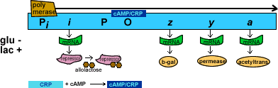 With the operator free, RNA polymerase can bind to and transcribe DNA. But the prescense of glucose has a dampening effect on transcription of the lac operon by a mechanism involving cAMP. Cyclinc AMP activates a protein called catabolite activation protein (CAP) which binds to the lac operon promoter and accelerates transcription. But in the presence of glucose, there is little cAMP available and the lac operon is transcribed at a lower rate. When glucose is not available, cAMP levels are high and available to bind and activate CAP, which in turn binds to the lac operon promoter and accelerates transcription.