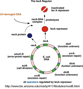 A regulon is a group of operons under common control, i.e. they have a common repressor. Damage to E. coli DNA triggers a coordinated response called the SOS response. Which is regulated by lexA. The SOS regulon includes the lexA gene along with many other genes encoding enzymes that act to repair damage. In undamaged cells, most of the SOS genes are largely repressed by binding of lexA to the operator site in the regulatory region. When damage blocks replication forks leaving single stranded DNA, RecA binds and is activated, causing the cleavage of lexA. The cleaved lexA cannot bind to operators, so the set of operons in the SOS regulon is induced. When damage is repaired, RecA is deactivated and no longer cleaves lexA.