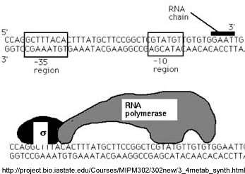 An E. coli promoter has a sequence called a Pribnow box, which is on average TATAAT, about 10 nucleotides upstream from were the RNA polymerase will start synthesis. There is another promoter box 30-35 nucleotides upstream with the average sequence TTGACA. Genes whose promoters are very similar to these average sequences are transcribed at a higher rate because they are good substrates for the a2bbs RNA polymerase (i.e. with the s subunit).