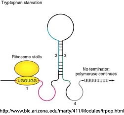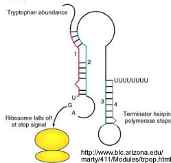 The attenuator sequence contains tandem repeats of the tryptophan codon and is capable of forming several different stable stem-loop structures. Because of the tandem Trp codons and depending on the level of tryptophan in the cell, the rate of translation allows different stem-loops to form. If tryptophan is abundant, the ribosome favors formation of a loop near a region rich in uracil. Such a loop acts as the transcriptional terminator loop, therefore RNA polymerase is dislodged from the template.