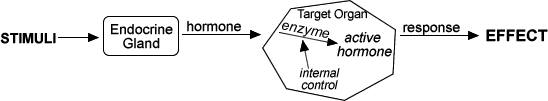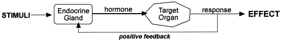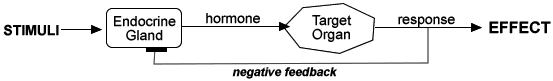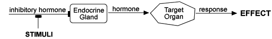 Endocrine function is carefully controlled by five mechanisms: simple control, negative feedback, positive feedback, inhibitory control and metabolic control. In a simple control mechanism, hormone is produced in small amounts and for short time periods. Often the target organ can only respond to certain hormone level. An example of simple control ???