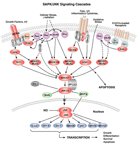 RANKL, a signaling molecule involved in hormonal control of calcium homeostasis, signals through the Ras/MEKK/JNK/Jun pathway.