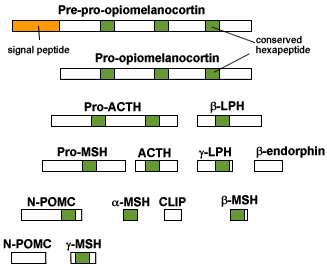 Adrenocorticotropic hormone (ACTH), aMSH, bMSH, gMSH and bLPH are all derived from pre-pro-opiomelanocortin (POMC), and they all have some melanotropic activity. aMSH is derived from proteolytic processing of ACTH, which also generates the CLIP peptide, its role if any still unclear.