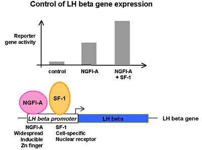 The transcription factor NGFI-A is a widespread a zinc finger trancription factror (also known as Egr-1) that seems to regulate bLH gene espression. At the same time the cell-specific nuclear receptor SF-1 seems to synergize with NGFI-A to increase bLH expression. Mice with a mutated NGFI-A transcription factor appear normal at first, but females are infertile: they have no estrous cycle, their uteri are 30% smoler than wild type, and their progesterone levels are reduced, although estrogen is normal. They have normal levels of bFSH and GnRH-R, but bLH cannot be detected. Treatment with pregnant mare serum increases uterine size in NGFI-A knockout mice, suggesting a pituitary defect. Knockout males have some LH but their interstitial cells are atrophied. Still, the seminal vesicles are fine and the animals are fertile. When the animals were ovarectomizzed to remove the gonadal negative feedback on gonadotropins, FSH levels increased 5 times in both wild type and knockout animals, but LH increased 5 times only in wild type animals.