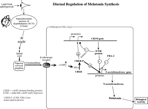 Melatonin synthesis is regulated by . During dark periods, norepinephrie signaling from the cervical ganglia activates the cAMP pathway in pinealocytes. Increased cAMP levels activate protein kinase A (PKA), which in tur activates the transcription factor CREB. The NAT gene has a CREB responsive element (CRE) in its promoter, leading to increased levels of NAT and melatonin. The ICER protein inhibits NAT gene transcription, and the CREM gene that is the source of ICER also has a CRE in its promoter (negative feedback). ICER also blocks its own transcription. Less is known about another inhibitor of NAT transcription, FRA-2.
