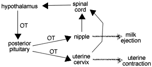 Oxytocin is released from the posterior pituitary in response to active touch receptors in the nipple (milk ejection) or stretch receptors in the uterine cervix (uterine contraction). It also plays a role in maternal behaviours, sexual function (orgasm) and stress response. The same receptors trigger nervous signiling through the spinal cord, acting as a positive feedback loop into the hypothalamus to increase oxytocin release.