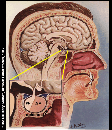 The pituitary gland, also known as the hypophysis, is located at the base of the brain just behind the nasal cavity. It is inside a pocket (sellaturcica) formed by the sphenoid bone. The human pituitary gland has two lobes: anterior and posterior. Each lobe has a different embryonic origin and secretes a different set of hormones. A third area, the pars intermedia, contains different cells than the anterior and posterior lobes. While in other animals the pars intermedia is a discrete third lobe, in humans consist of dispersed cycts in the anterior lobe.