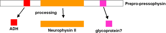 Vasopressin is also made from a precursor, prepro-pressophysin, that is processes as it travels to the posterior pituitary.