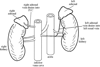 The adrenals are two glands located over each of the kidneys that mediate the body's short and long term responses to stress. They have a very good blood suply. The right adrenal drains to the inferior vena cava, whil the left adrenal drains to the left renal vein. The glands have two structuraly different areas: the medulla and the cortex.