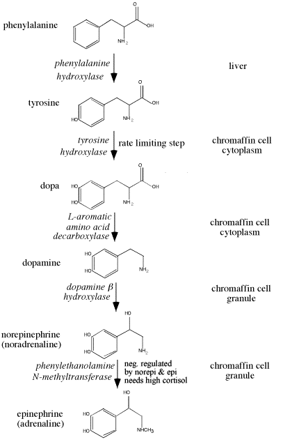 Catecholamines are made from tyrosine produced by the liver. The rate limiting step is the conversion of tyrosine to dopa by tyrosine hydroxylase in the cromaffin cell's cytoplasm. Dopa is converted to dopamine, which in turn is collected by granules.