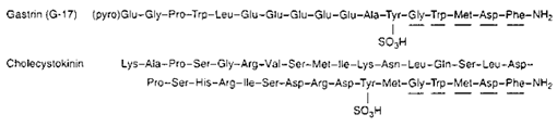 Gastrin and cholecystokinin (CCK, aka pancreozymin) have identical C-terminal pentapeptide sequences (gly-trp-met-asp-phe-NH2). The rat CCK can be spliced into 5 different forms of the hormone: CCK precursor (115 a.a.), CCK-58 (58 a.a.), CCK-39 (39 a.a.), CCK-33 (33 a.a.), and CCK-8 (8 a.a.; a brain hormone!).