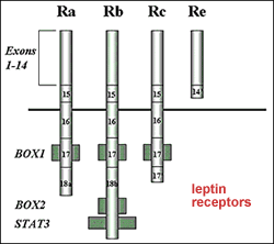 The ob (obesity) gene was finally cloned by Zhang et al (Nature 1994). It is expressed in adipose tissue and codes for a 16 kDa secreted protein named Leptin ("leptos" means lean in Greek). A C-to-T mutation changes Arg105 to a stop codon in the ob/ob mice. Chen et al (Cell 1996) cloned the db (diabetes) gene, which codes for multiple forms of the leptin receptor. The long form (Rb) signals similarly to the GH receptor (cytopkine; Jak/Stat pathway) and is found in the hypothalamus. The function of the short forms also found in the hypothalamus is unclear. A soluble form, mostly the extracellular domain of the long forms, is found in many tissues and binds 20-50% of the free leptin. Signaling of the short form is unclear, but may have a clearance function.