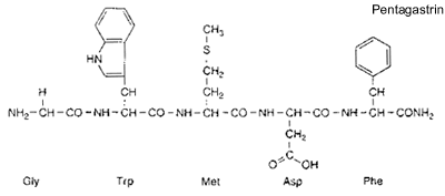 Gastrin activates IP3 pathways through the CCKB receptor. The synthetic (?) pentagastrin peptide (gly-trp-met-asp-phe-NH2) is a fully active agonist of the gastrin response.