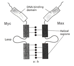 Myc is a transcription factor with a basic region followed by a helix-loop-helix-leucine zipper motif. It dimmerizes with another transcription factor, Max. Max/Max homodimmers exist, but Myc does not dimmerize with itself.
