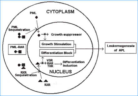 | Experimental Results: The “differentiation block” of acute promyelocytic leukemia can be alleviated with retinoic acid (drug name Tretinoin). [Warrel et al. Differentiation therapy of acute promyelocytic leukemia with tretinoin (all-trans-retinoic acid). N. Engl. J. Med. 324; 1385-1393, 1991]