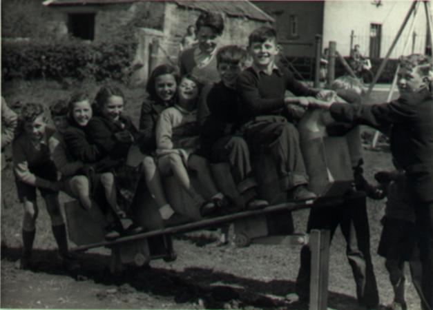 The Park at some time in the 1950s - from front of horse - Jack Blair, Eric Low, ? McLaren, Alex Pearson, ??, Anne Young, Nessie Simpson, Anne Morrison, ??, Robert Blair. Picture sent by Nessie Simpson