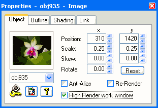 Band along an edge of thumbnail. If you are reusing an existing geometry or clone for your thumbnail, you may find a band appearing along one edge of the thumbnail when published (but not in workpage view). If so, make sure you have Anti-Alias and Re-Render off for the image. (Object Editor > Object tab). This is the opposite of the previous case where you want to create a new image. See Extra step for clones.