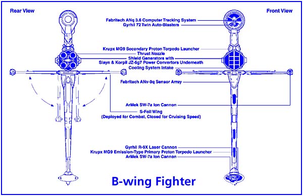 One of the alliance's most heavily armed starfighters, the B-wing, in effect, is one long, flat wing with an unusual rotating cockpit at one end, and one of the ship's three ion cannons at the other. About midway on the wing are two airfoils that extend during combat, giving the ship the appearance of a cross.