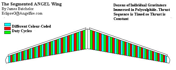 T.T.Brown noted during his experiments that the thrust exhibited by a condenser would diminish with time. Condensers which had an air dielectric could thrust continually, and it was eventually deduced that this was because the moving dielectric prevented the condenser from ever reaching full charge. Sadly, air is fairly puny as a dielectric for a craft, but a craft whos thrust dies after a matter of seconds is also. Thus, the segmented system is now in the ANGEL plans, in order to ensure a steady powerful thrust from polysulphide without losing energy.