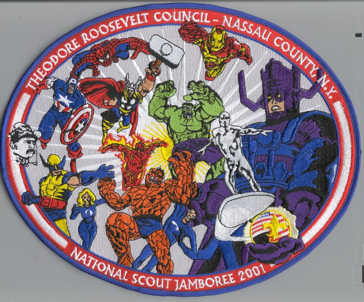 These are my council's patches. They were worth platinum at the Jambo. Theodore Roosevelt Council did get the copyrghts to all the images in the patches. Marvel Comics also drew the patches for the council. All the patches say "© Marvel Comics" in ghost on the side.