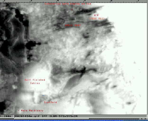 It has been nearly a year since Malin released the first group of 30,000 plus photos of Mars he had been sitting on for more than two years! Has any mainstream media brought up anything about the most unusual artifacts people have been trying to get public? There has been at least two civilizations up there. One must have been ancient. Another one may be recent visitors. Last month Sir Arthur C. Clarke went public with "There must be large life on Mars." He even went on the BBC in England and showed the Enterprisemission.com website on there T.V. with the photos Richard C. Hoagland found of "glass worms" or tunnels. Naturally, NASA replied with it is just wind erosion. Then, the esteemed Dr. Tom Van Flandern responded with real scientific analysis pointing out what a sheer impossibility wind erosion would be due to lack of force from such a thin atmosphere. Is anybody out there paying attention? Oh, yes, want to see the starship? Visit www.mars-mania.com and read Part II. The enhanced (gamma corrected only) photo is at the bottom of the page (and above). For those who prefer something that looks like a nuclear power plant check out the five story building with the smokestack at the bottom of Part I.