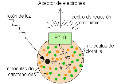 - un complejo antena, formado por varios centenares de moléculas de clorofila y carotenos.