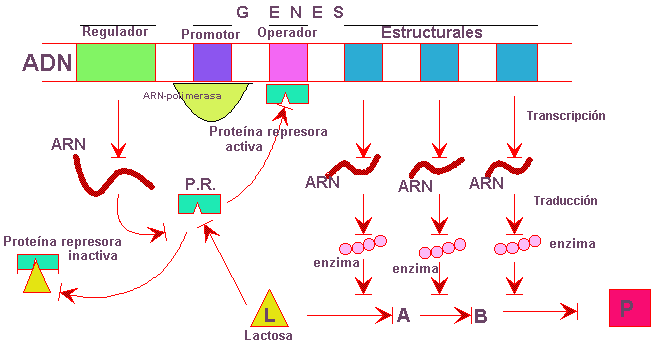 Como puede verse en el esquema, cuando aparece la lactosa (molécula inductora), se une a la proteína represora inactivándola; entonces el complejo inductor-represor se separa del operador, permitiendo el funcionamiento del operón.