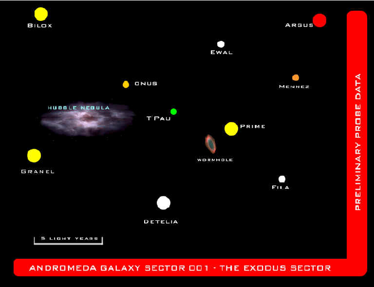 As the lights dim, a vague stellar map appears on the auditorium viewscreen. It is labeled 'Andromeda Galaxy Sector 001 - The Exodus Sector'. A pretty standard, if nondescript, map seems to indicate several potentially habitable systems, if you remember your stellar cartography training from the Academy correctly.