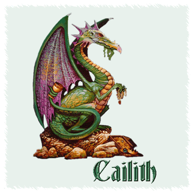 Cailith is an adult green(therefore female) dragon of slightly larger than average size for her colour/sex. She has an unusually complex sense of humour for a dragon which she needs to offset her weyrmate, Callisto's,very forthright manner. Since reaching her maturity she has shown a great sensitivity when on Search and is gaining a reputation for picking potential bronze riders.