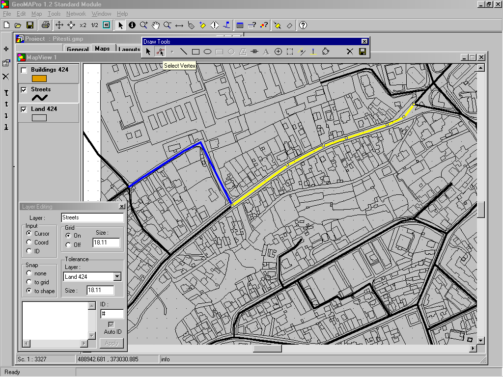 Se stabileste tipul layer-ului si vor aparea doua ferestre : o bara sus cu uneltele pentru editare / desenare si o a doua fereastra care controleaza modul prin care sunt introduse elementele grafice: cursor (mouse) , prin coordonate reale (de la tastatura) sau prin ID-urile unor puncte dintr-un alt layer de referinta, precum si daca elementele introduse prin mose vor face "snap" (se vor uni) in functe de o toleranta fie de grid , fie de elementele unui alt layer. Cand se vor introduce coordonatele reale ale elementelor , acestea vor fi despartite prin virgula.