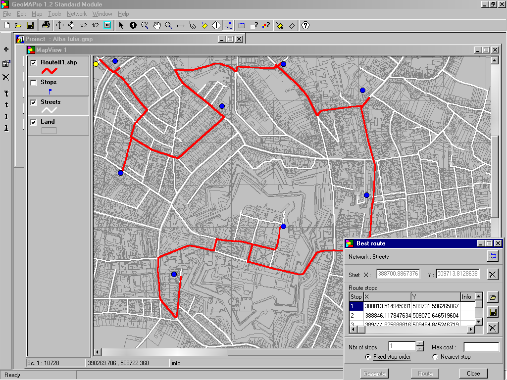Modulul Analiza de retea permite determinarea traseului optim intr-un layer de tip linie intre doua sau mai multe puncte selectate de utilizator..