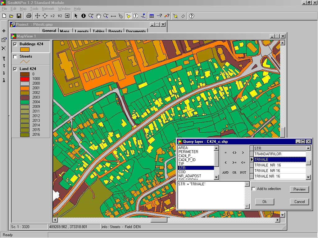 Se selecteaza un camp si in lista alaturata vor apare valorile acestuia din tabela asociata. Se construieste cu ajutorul butoanelor (sau se scrie) expresia dupa care dorim sa cautam elementele si optiunea Query executa interogarea. Elementele gasite conform cererii vor fi colorate in galben. Acestea pot fi exportate intr-un nou shapefile pe hard.Astfel se pot selecta duar casele sau drumurile dintr-un shp sau din mai multe.