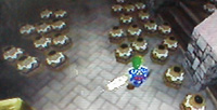 Market--at the entrance to the market, there is a room with a lot of jars. Throw them or break them with your sword to get a lot of Rupees in a short time. When you run out of jars, leave the room and then go back in: the jars will be back. Although you can get as many Rupees as you want with this, it takes a little time and can get boring after awhile. Kakariko Village: the Chicken Lady--the lady will give you 50 Rupees if you collect all of her chickens and put them in the pen. (The first time you do this, she gives you a bottle). This can be fun, but again, can get tedious after awhile. There are much faster ways to get 50 or more Rupees, but for the record, there are seven chickens: one near the pen, one up near the gate to Death Mountain, one near the gate to Hyrule Field, one in a box near one of the houses, one on a ledge next to the house of Skulltula (to get this you need to get another chicken and jump off of the nearby higher ledge, then throw away the chicken you are carrying and get the other one), one behind the big fence near the windmill, and one up on the high ground behind the windmill. To get the last two, take another chicken and run along the ledge in front of the windmill and jump off, aiming for the small fence on the ledge next to Granny’s Potion Shop. Throw both the chicken that you flew over with and the chicken down by the fence over to the other side, then climb the ladder and jump off with the last chicken. Don’t fall down the hole in the ground while you’re doing this, or all of the chickens will return to their original positions. If you leave to the Graveyard, Death Mountain Trail, or Hyrule Field before finishing, you have to start over.