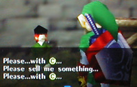 The “Sell Me Something with C” guy in the Market--when you have a bottle, catch a fish or a bug and sell it to the guy. He pays 100 Rupees for each fish, and 50 for each bug. If you have more than one bottle, you can multiply your bug supply by letting it go and catching two or three of them. This is probably the fastest and easiest way to get cash, especially if you have 3 or 4 bottles. There’s no sport in it, though. If you can’t find any bugs or fish, just jump into one of the holes in the ground (there’s one in the field to the right as you exit the Market). In the secret grottos, there’s always a small puddle with a fish, and two clumps of grass with 3 bugs each. Fish are also plentiful in Zora’s Domain and Lake Hylia. The small rock near the House of Skulltula in Kakariko Village always has 3 bugs under it, as do the ones near the graveyard and the tree on the way to the castle. Once Link is Grown Up--Once Link is grown up, money is just a little harder to come across, but there are still a few good places. The “Sell Me Something” guy has relocated to Kakariko Village, but still pays the same prices for the fish and bugs. The room in at the entrance to the Market is now a ghost shop, but there are still a few jars, and one of them has a Red Rupee in it. The Diving Game and Forest Stage can’t be used when Link is and adult, because Zora’s Domain is frozen and Adult Link can’t wear the masks.