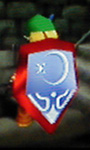 ![]() | Deku Shield--you buy this from the Kokiri Store. It is made of wood, so don't use it against an enemy that blows fire. It is useful for Child Link to bounce Deku Nuts back at the Brush Scrubs (spitters). |